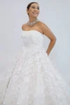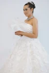 The Enchanted Bloom Bridal Gown is a masterpiece of couture artistry, designed for the bride who dreams of walking through her special day adorned in romance. Crafted with a structured strapless satin bodice, the gown cascades into a voluminous skirt embellished with three-dimensional floral appliqués, delicate pearls, and soft feather textural details that evoke the beauty of a blossoming garden.