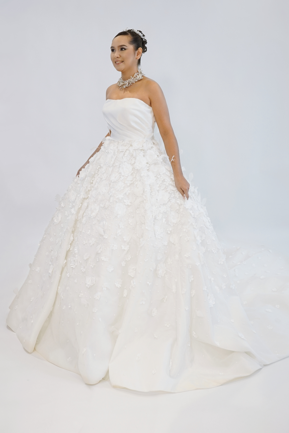 The Enchanted Bloom Bridal Gown is a masterpiece of couture artistry, designed for the bride who dreams of walking through her special day adorned in romance. Crafted with a structured strapless satin bodice, the gown cascades into a voluminous skirt embellished with three-dimensional floral appliqués, delicate pearls, and soft feather textural details that evoke the beauty of a blossoming garden.