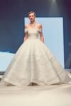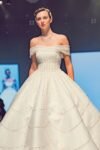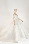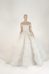 Step into the spotlight with this breathtaking off-the-shoulder gown. Its delicately beaded bodice creates a subtle shimmer that catches the light beautifully. Cascading down from the cinched waist, the skirt unfolds in voluminous tiers, each accented with beaded trim that enhances the gown’s exquisite silhouette. The luxurious fabric flows effortlessly to the floor, culminating in a dramatic train that promises to leave an unforgettable impression. Perfect for a gala or any high-end event to make a statement. This gown will captivate and enchant all who lay eyes upon it.