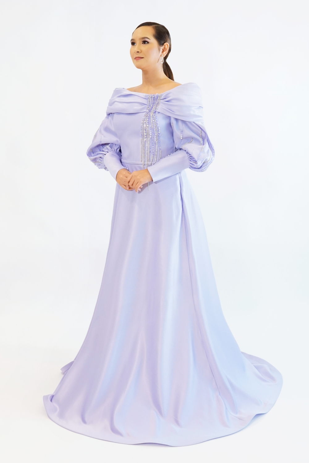 Turn heads with this exquisite lavender gown, meticulously crafted for elegance and sophistication. Its off-the-shoulder puff sleeves and intricate beadwork lend a touch of regality, while the floor-length satin-like skirt flows gracefully, ensuring you make a stunning entrance at any evening affair. Perfect for weddings, galas, or formal celebrations, this dress is where luxury meets timeless charm.
