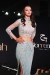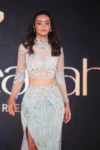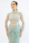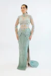 Step into a realm of timeless sophistication with this exquisite gown, meticulously crafted from luxurious Russian silk. Every inch is adorned with intricate, hand-made embroidery that cascades like shimmering stardust, highlighted by delicate floral embellishments in pastel hues. Designed to embrace feminine grace, the high-neck sheer bodice flows into a figure-hugging silhouette, elevated with a dramatic front slit for modern allure. A true couture masterpiece that blends artistry with elegance, making it perfect for red-carpet moments, luxury soirées, and unforgettable celebrations.