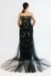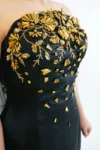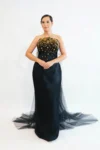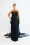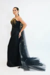 Elevate your presence with our Opulent Black Strapless Gown, a masterpiece of modern elegance. This striking gown features a sleek black satin bodice adorned with intricate golden embellishments, including floral appliques and shimmering studs, creating a bold yet refined look. The flowing tulle train, delicately accented with gold details, adds a dramatic flourish, perfect for making a statement at galas, red-carpet events, or upscale soirées. Embrace timeless luxury with this show-stopping design.