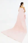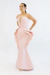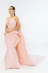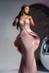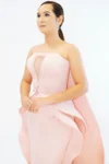 Step into the spotlight with the Blush Reverie Couture Gown, a masterwork of elegance crafted in luminous bridal satin. The gown features a sculpted strapless bodice adorned with delicate beadwork framing a daring illusion cutout, seamlessly blending sophistication with allure. Flowing architectural drapes accentuate the hips, cascading into a sleek mermaid silhouette that celebrates feminine form.