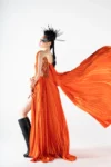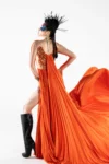 The gown’s long, dramatic satin cape tails create sense of effortless grandeur as they catch the breeze. Designed to stand out against any backdrop, the Desert Blaze Gown is ideal for bold fashionistas attending outdoor galas, destination weddings, or high-fashion photoshoots. The rich, fiery hue evokes the warmth of a desert sunset, ensuring you radiate confidence and charisma.