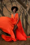 Unveil your inner goddess with the **Desert Blaze Gown** – a striking masterpiece that fuses elegance with daring allure! This vibrant orange, floor-length dress crafted from luxurious pleated satin, offers a flowing silhouette that dances with every movement. The deep V-neckline and strategic side cut-outs accentuate your figure. The high leg slit adds a touch of sultry sophistication, perfect for making an unforgettable entrance.