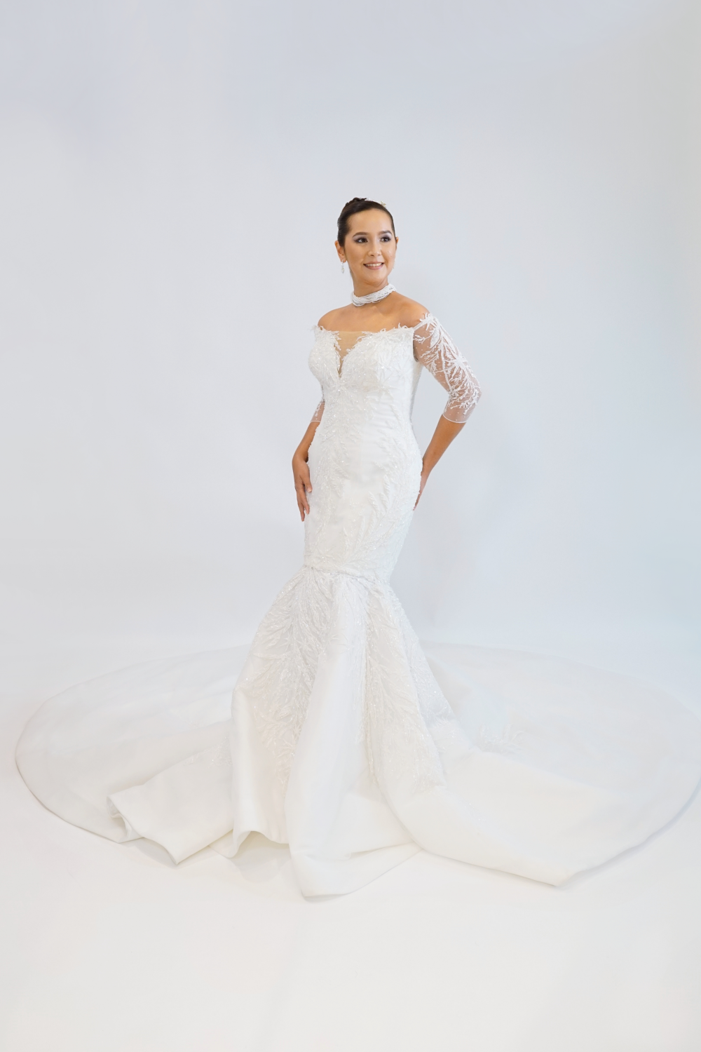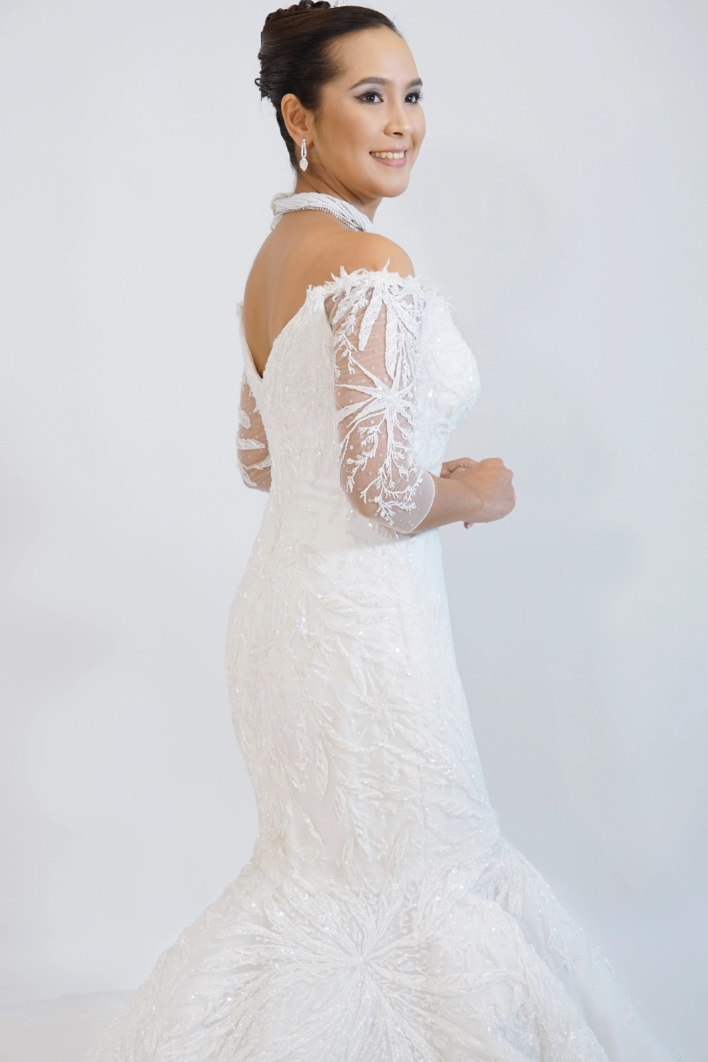 Embrace your inner goddess with this breathtaking off-the-shoulder mermaid wedding gown, designed to captivate and enchant. Intricate embroidered lace adorns the V-neck bodice, seamlessly flowing into delicate three-quarter sleeves that add a touch of romance. The fitted silhouette hugs your curves, flaring out into a dramatic, embroidered train that sparkles with every step. Perfect for the bride who craves elegance with a modern twist. This gown promises to make your wedding day as unforgettable as your love story. Shine brilliantly in this exquisite masterpiece!