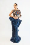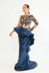 Introducing the **Stardust Rebel Gown**, a dazzling fusion of bold artistry and shimmering elegance. This floor-length dress features a mesmerizing deep blue sequined skirt that catches the light with every movement, creating a radiant, starlit effect.