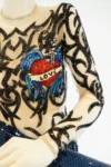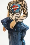 Intricate black beadworks adorn the upper bodice in a work of art, weaving a story of rebellion and romance. The knife-striked heart motif with the word “LOVE” show forth boldly in the design. Its vibrant romance of red and blue details instantly catches your attention surrounded by black artwork background.
