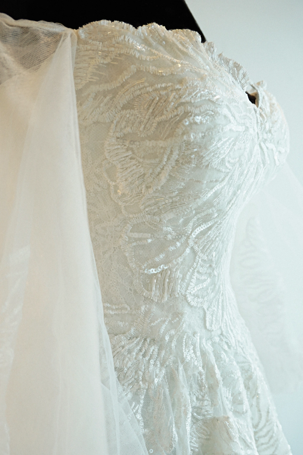 Fabric: Lace and tulle with intricate beading   Embroidery Time:  More than 130 hours dedicated to its embellishments adorning its Lebanese lace