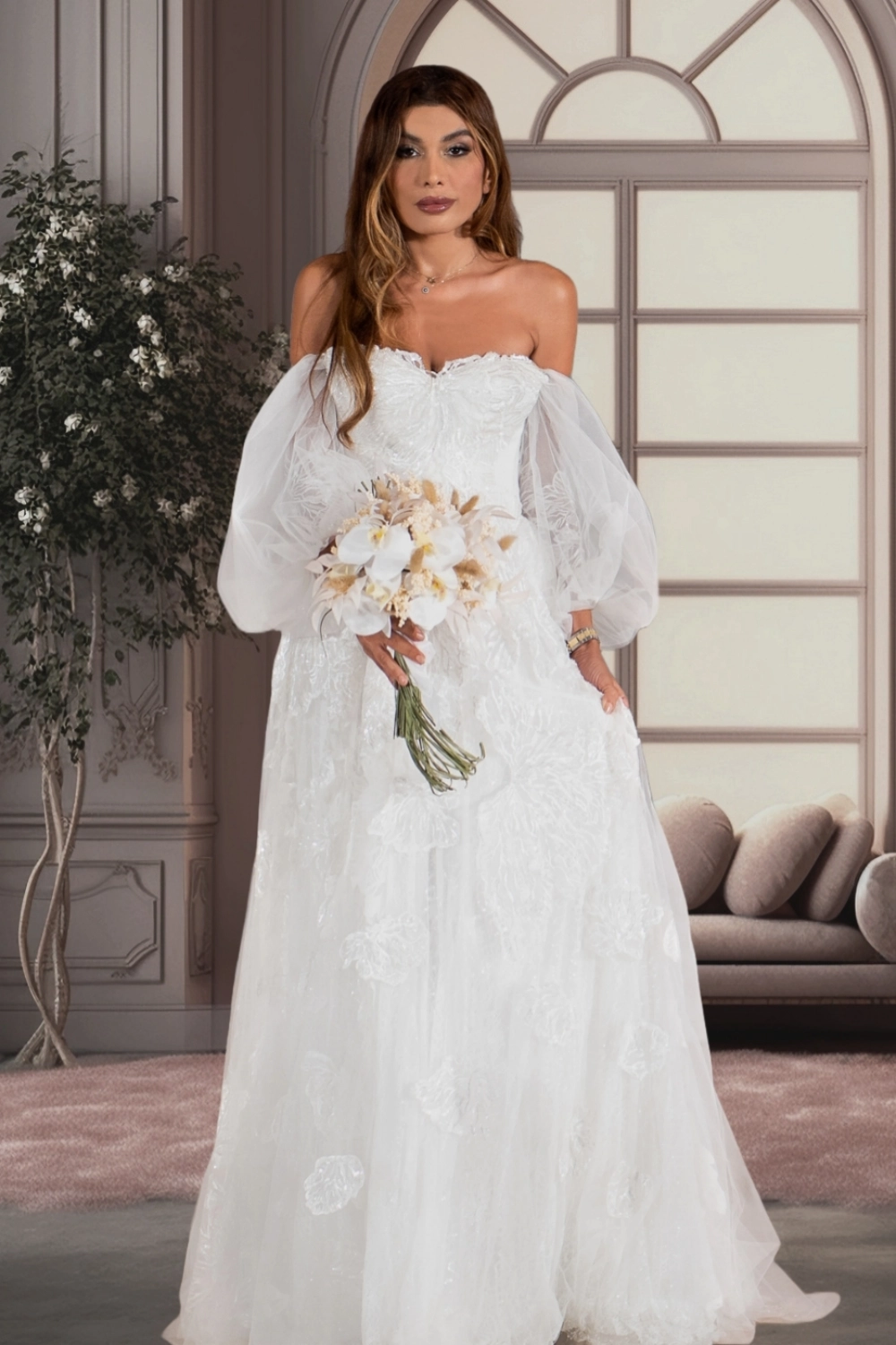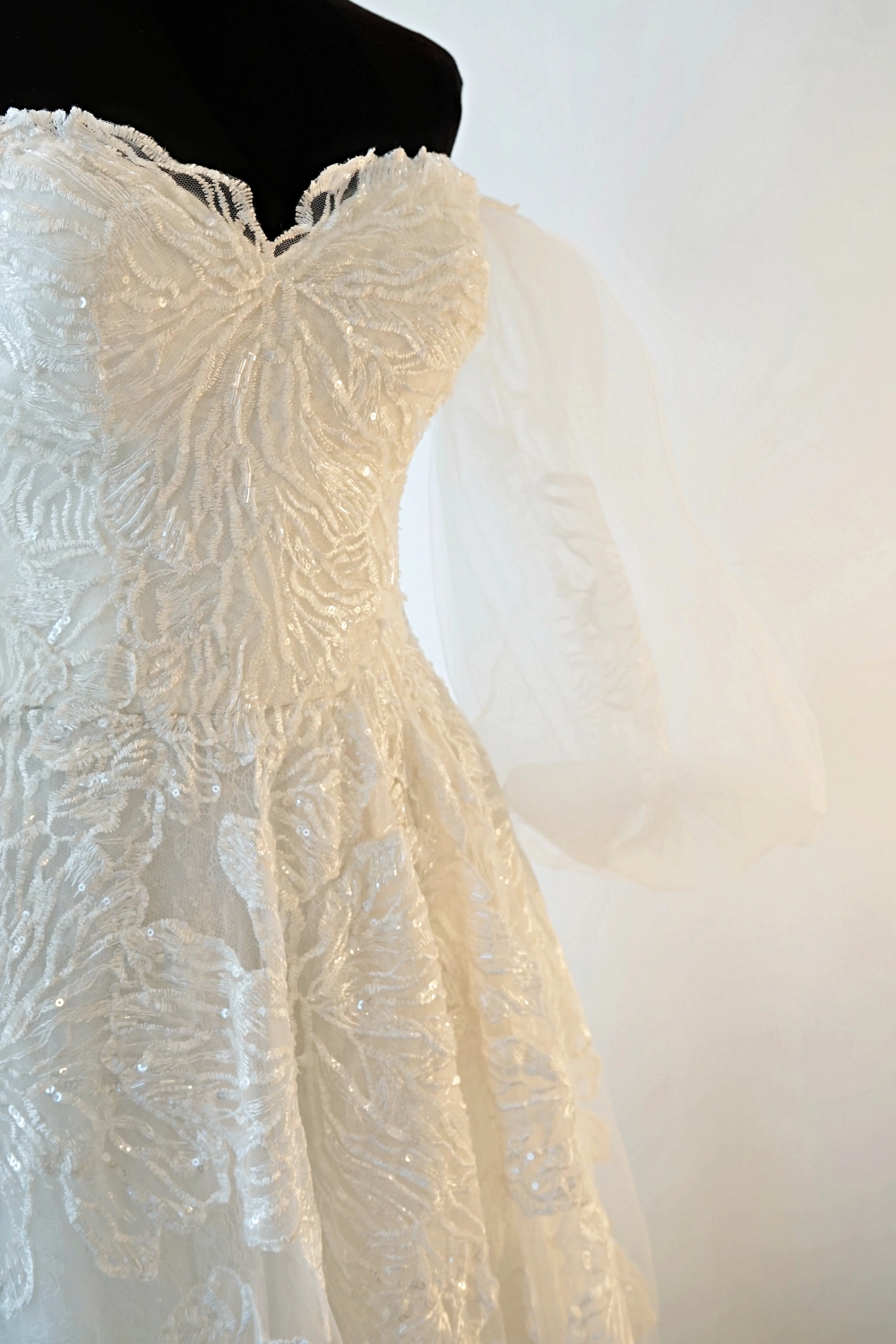 Step into enchantment with this romantic off-the-shoulder A-line wedding gown, designed to make your special day truly unforgettable. Intricate floral embroidery patterns adorn the sweetheart neckline bodice, perfectly complemented by whimsical, sheer puff sleeves adding a dreamy touch. The flowing skirt, layered with delicate tulle and subtle sparkle, cascades into a graceful train, creating a fairy-tale silhouette. Ideal for the bride who dreams of timeless elegance with a modern twist. This gown will make you feel like royalty as you walk down the aisle.