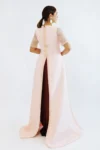 Graceful, refined, and timeless—this dual-toned evening gown exudes quiet sophistication. Designed in a soft blush outer layer accented with intricate embroidery on the sleeves and borders, it beautifully frames a deep wine-hued inner panel for a striking contrast. The modest neckline and flowing silhouette strike the perfect balance between elegance and modern femininity, making this gown ideal for formal gatherings, cultural celebrations, or distinguished evening occasions.