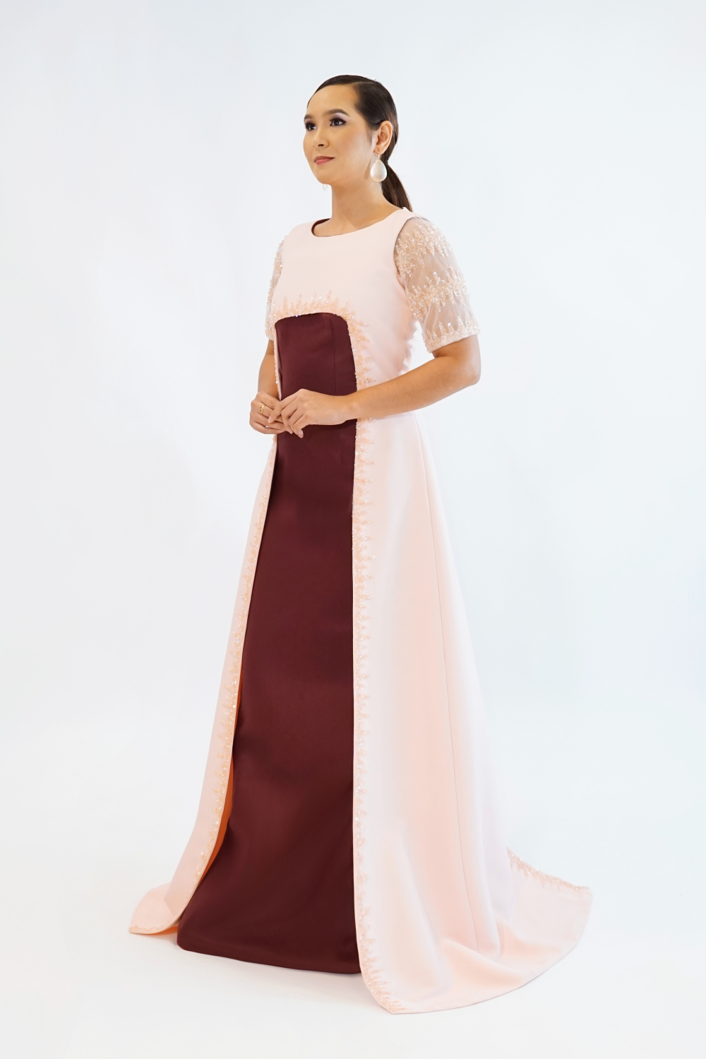 Graceful, refined, and timeless—this dual-toned evening gown exudes quiet sophistication. Designed in a soft blush outer layer accented with intricate embroidery on the sleeves and borders, it beautifully frames a deep wine-hued inner panel for a striking contrast. The modest neckline and flowing silhouette strike the perfect balance between elegance and modern femininity, making this gown ideal for formal gatherings, cultural celebrations, or distinguished evening occasions.