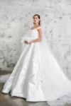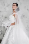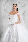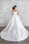 Step into fairy-tale romance with this breathtaking A-line gown, meticulously crafted from luxurious mikado silk that offers a smooth, lustrous finish. The off-shoulder bodice is adorned with intricate floral appliqués and shimmering beadwork, creating a stunning focal point that exudes sophistication. Paired with a sweeping train and a delicate tulle veil, this gown combines timeless elegance with modern flair, ensuring you shine as the epitome of grace on your wedding day. Perfect for the bride who dreams of a majestic and unforgettable entrance.