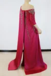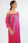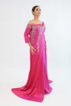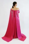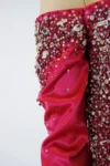 A vision of opulence, this couture gown is meticulously tailored from the finest Russian silk, flowing in a vibrant fuchsia hue that embodies both power and femininity. The off-shoulder silhouette frames the décolletage with effortless grace, while hand-applied crystals and sequins cascade like stardust across the bodice and cape, catching the light with every movement. The dramatic train trails behind in regal splendor, transforming each step into a statement of majesty. Designed for the modern muse who commands the room with quiet confidence, this gown is not merely attire—it is an heirloom of elegance, artistry, and allure.