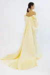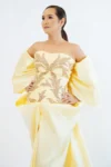 Step into the spotlight with our Golden Grace Gown, a masterpiece of elegance and sophistication. This off-shoulder, floor-length dress features a soft yellow hue enriched with intricate gold embroidery that shimmers with every movement. The voluminous sleeves and flowing skirt create a regal silhouette, perfect for making a grand entrance at any formal event. Designed to radiate timeless beauty, this gown is your go-to for unforgettable moments.