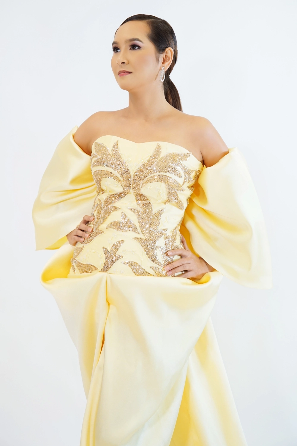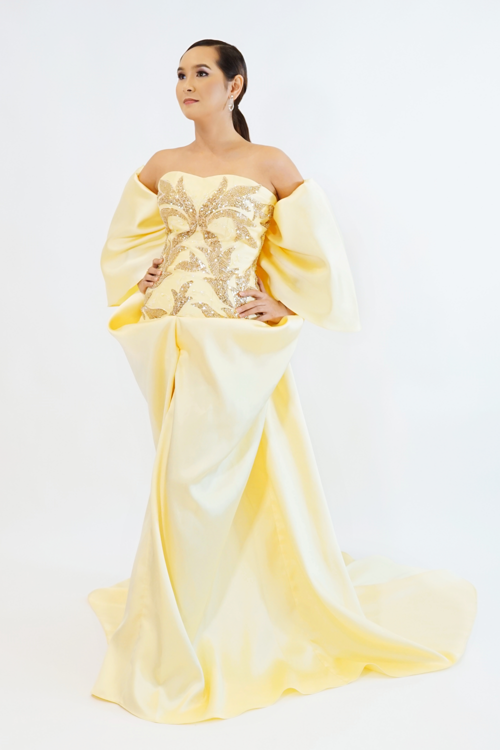 Step into the spotlight with our Golden Grace Gown, a masterpiece of elegance and sophistication. This off-shoulder, floor-length dress features a soft yellow hue enriched with intricate gold embroidery that shimmers with every movement. The voluminous sleeves and flowing skirt create a regal silhouette, perfect for making a grand entrance at any formal event. Designed to radiate timeless beauty, this gown is your go-to for unforgettable moments.