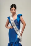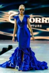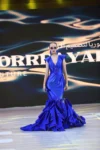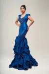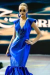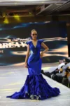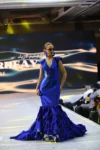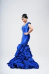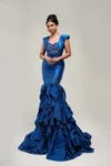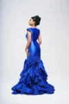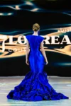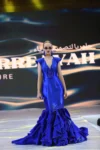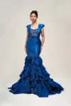 The “Midnight Cascade” gown is a true statement of couture artistry, sculpted in luminous royal blue satin. Its structured bodice, accented with soft draping at the neckline and subtle cap sleeves, highlights the feminine form with refined strength.