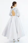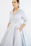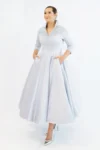 Step into timeless elegance with this exquisite midi dress. Crafted from luxurious satin, it features a sophisticated V-neckline and delicate lace detailing on the bodice and three-quarter length sleeves. The cinched waistline flows into a voluminous skirt, creating an enchanting silhouette that sways gracefully with every step. Perfect for special occasions, this dress combines comfort and style, ensuring you make a statement wherever you go.