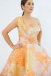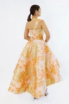 Opulent Charm: Peach and Orange Embroidered Beauty Step into the spotlight with this stunning dress, featuring a captivating blend of peach and orange hues. The intricate gold floral embroidery cascades gracefully down the full, voluminous A-line skirt, adding a touch of opulence. The fitted bodice with a sweetheart neckline enhances your silhouette, while the subtle sheen of the fabric ensures you shine at any event. Perfect for formal occasions where making a memorable impression is key.