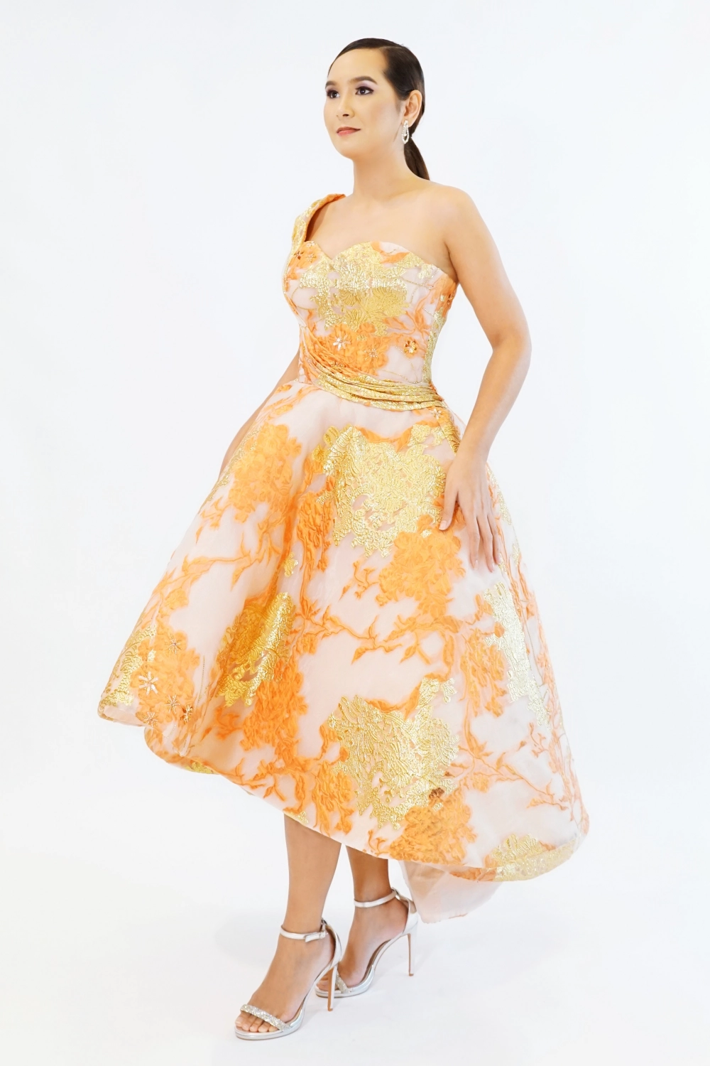 Opulent Charm: Peach and Orange Embroidered Beauty Step into the spotlight with this stunning dress, featuring a captivating blend of peach and orange hues. The intricate gold floral embroidery cascades gracefully down the full, voluminous A-line skirt, adding a touch of opulence. The fitted bodice with a sweetheart neckline enhances your silhouette, while the subtle sheen of the fabric ensures you shine at any event. Perfect for formal occasions where making a memorable impression is key.