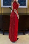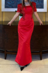 Introducing our elegant red gala gown – a showstopper designed to make you the center of attention. This stunning dress features short-puffed sleeves and a sleek, form-fitting silhouette with a straight-line cut to the hem, offering both grace and sophistication. Crafted from both a luxurious Duchesse satin fabric in a bold red hue and a red sequined fabric on the back side, this gown is perfect for upscale events where style is paramount.