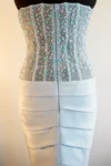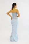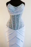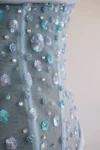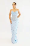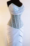Introducing our exquisite ice-blue evening gown, a masterpiece of elegance and sophistication. This stunning dress features a beautifully structured bodice adorned with delicate sequins and beads, creating a mesmerizing sparkle that catches the light with every movement. The draped neckline complements the bodice, adding a touch of romance and grace. The structured pleated, cascading skirt flows effortlessly, creates a modern twist to the classic silhouette. Perfect for any formal occasion, this dress exudes confidence and class.
