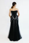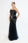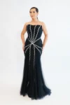 Elevate your presence with this exquisite strapless black gown, designed to captivate at any formal affair. Silver beading adorns the luxurious tulle fabric is adorned, flowing in wave-like patterns across the bodice, into a dazzling focal point. The flowing floor-length skirt creates a dramatic, ethereal silhouette, blending bold style with timeless elegance. Gown will make a statement at any gala, wedding, or red carpet moment and also a must-have for unforgettable evenings.