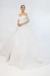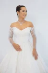 Step into a world of timeless romance with this exquisite off-the-shoulder A-line wedding ball gown. Make your special day truly magical with sunburst patterned embroidery works glimmering from your gown. Intricate lace saturated with crystals adorns the sweetheart neckline bodice, seamlessly flowing into delicate three-quarter sleeves that add a touch of sophistication. The voluminous skirt, embellished with shimmering embroidery, sweeps into a luxurious train. The gown will leave a breathtaking silhouette that exudes elegance. Perfect for the bride who dreams of a classic fairy-tale wedding. This gown will make you feel radiant as you walk down the aisle. Celebrate your love in this enchanting masterpiece!