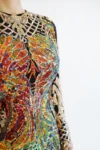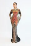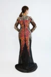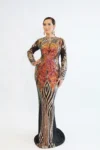 Ignite the night in our Vibrant Phoenix Flame Sequin Gown, a dazzling masterpiece that embodies fiery elegance and bold sophistication. This form-fitting, floor-length silhouette features sheer long sleeves and a black mesh base adorned with intricate multicolored sequins and beads. The embellishments create a mesmerizing flame-like pattern that cascades from the bodice in hues of crimson, orange, gold, emerald, and sapphire. Perfect for red-carpet events, galas, or any occasion where you want to command attention, this gown blends dramatic artistry with luxurious comfort, ensuring you rise like a phoenix in unparalleled style.