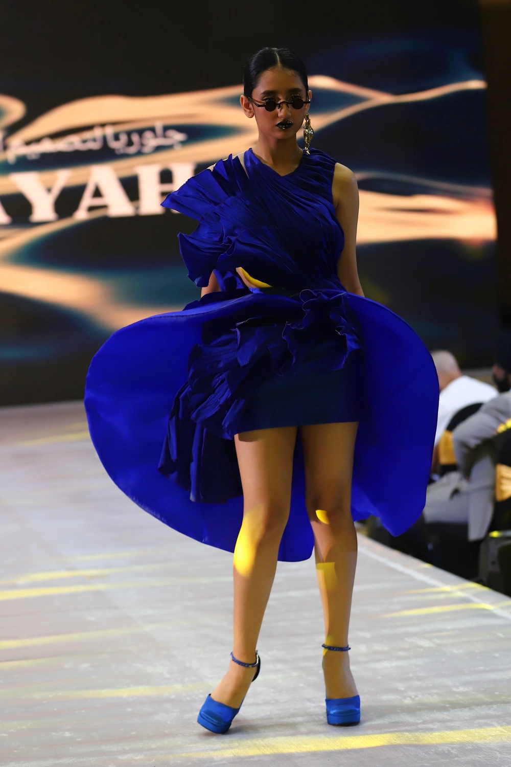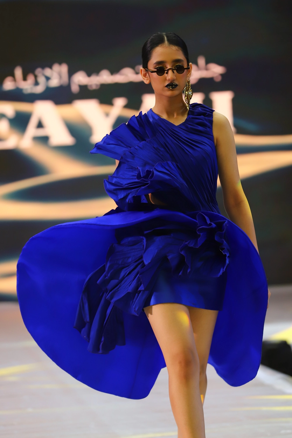 Step into a world of artistry with the “Waves of Elegance” couture dress. Designed in a commanding royal blue, this architectural piece envelopes both shoulders while maintaining a delicate illusion of openness with a sheer skin-tone tulle back. Sculpted pleats ripple across the silhouette, evoking the energy of ocean waves caught mid-motion.